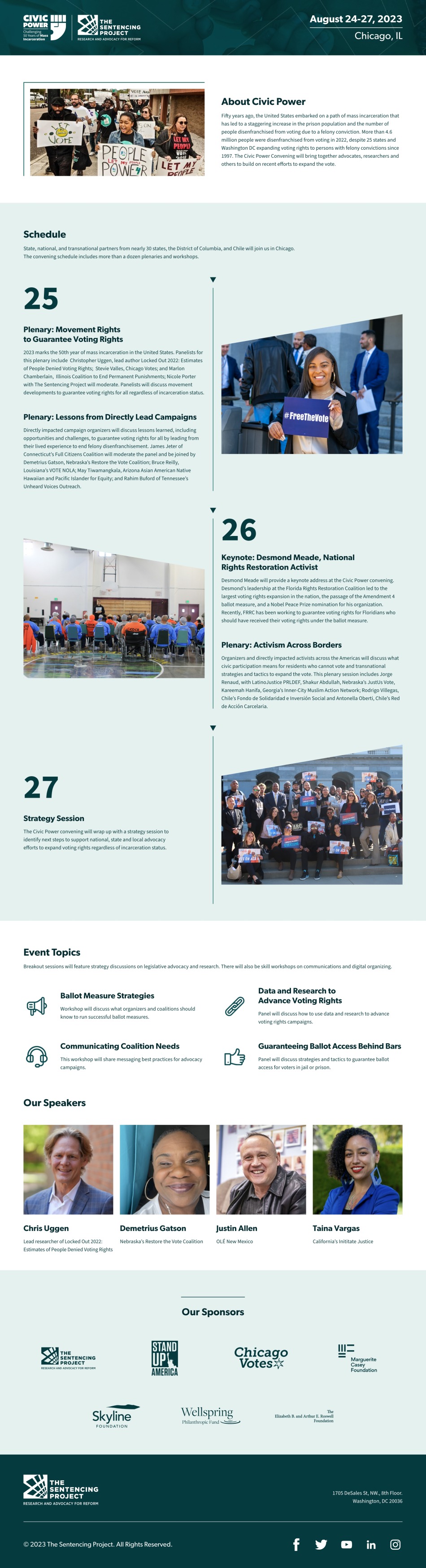 2025 marks the third year The Sentencing Project hosted Civic Power convenings with advocacy, academic, justice-impacted and philanthropy partners. This year, Civic Power brought together 132 advocacy organizers, researchers, communications specialists and others in Chicago to build on recent efforts to expand the vote and challenge mass incarceration. We would like to thank everyone who participated, including attendees, speakers, session organizers, sponsors, and our Convening Planning Committee.