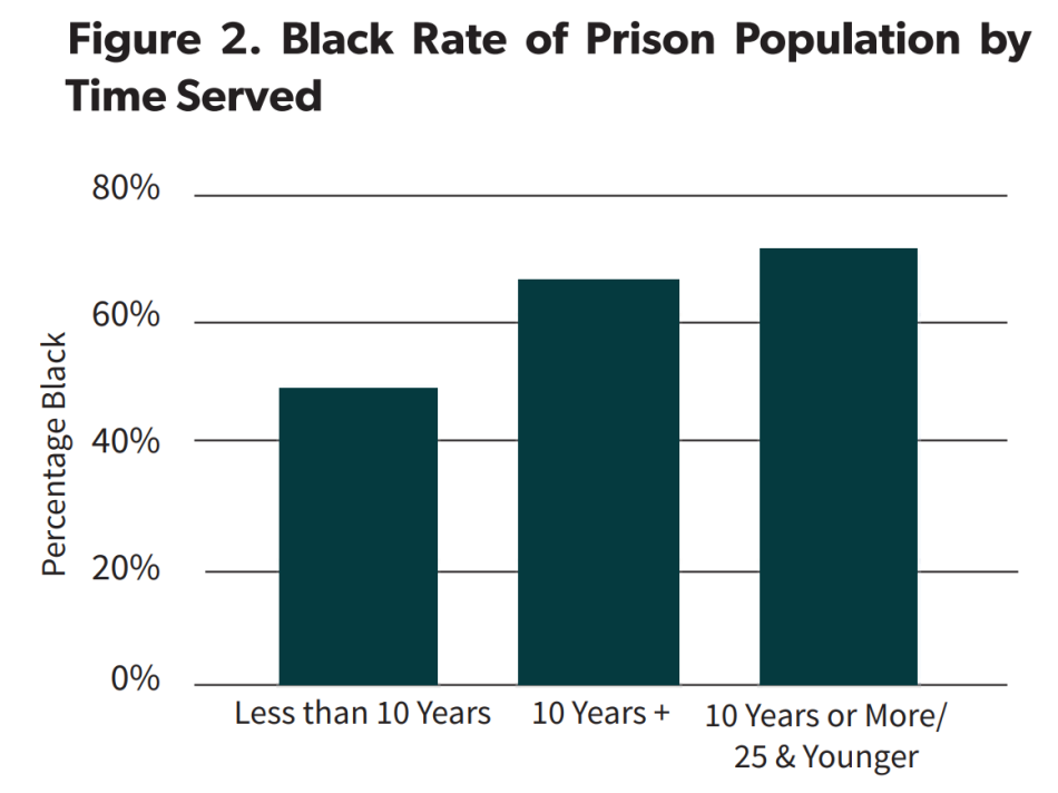 As shown below, nearly half (48%) of people who have been incarcerated for less than 10 years are Black, but 63% of people who have served 10 years or more are Black. Even more troubling is that among those who were young and have already served 10 years, 70% are Black.
