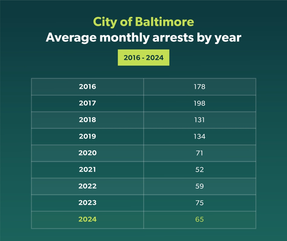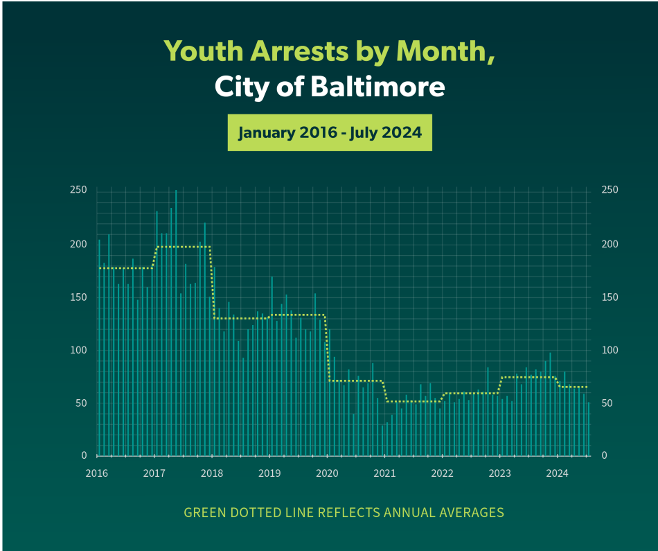 | 4. | Youth arrests: Baltimore City Police Department, Juvenile Booking Data Analysis Unit (2024, Aug. 21). “Juvenile arrest monthly report, July 1, 2024 to July 31, 2024.” Total arrests: Open Baltimore dashboard. Last accessed Aug. 27, 2024. |