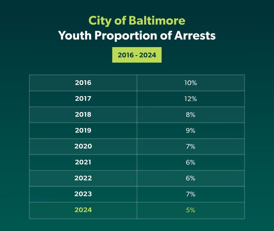 Based on data by the Baltimore Police Department, youth arrests have not only decreased significantly, but the proportion of youth involved in total arrests has also diminished.