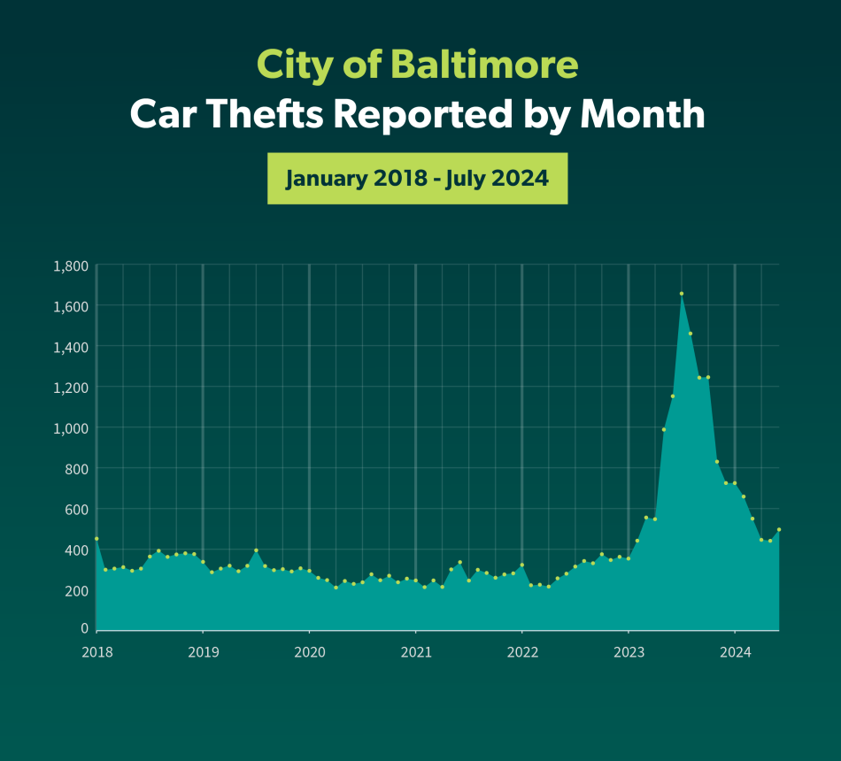 Baltimore experienced a car theft spike which peaked in the summer of 2023, driven by an increase in thefts of Kias and Hyndais, described by Car and Driver magazine (among others) as “easily stolen.”7 Incident reports do not provide any information about who committed those offenses. From 2018 to 2022, roughly 300 cars were reported stolen per month in Baltimore.8 An increase that began in the summer of 2022 spiked through the first half of 2023, peaking at over 1,600 — more than five times the typical average in prior years. That number has fallen steadily since, averaging 550 stolen cars per month thus far in 2024 — still well above the prior average but showing a promising trend.