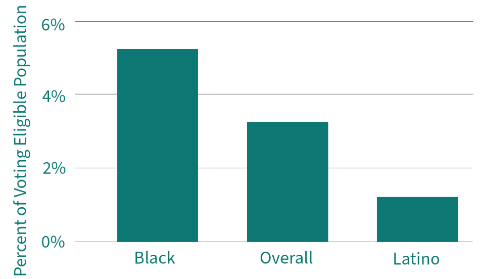 Georgia denies the right to vote to more than 249,000 of its citizens with a felony-level conviction. Georgia’s rate of voter exclusion exceeds the national average – 3.25% of the state’s voting age population versus 1.7% nationally. This ban from the ballot box falls heavily on people of color. Voting eligible Black Georgians are over two times as likely as non-Black Georgians to lose their right to vote due a felony-level conviction.1