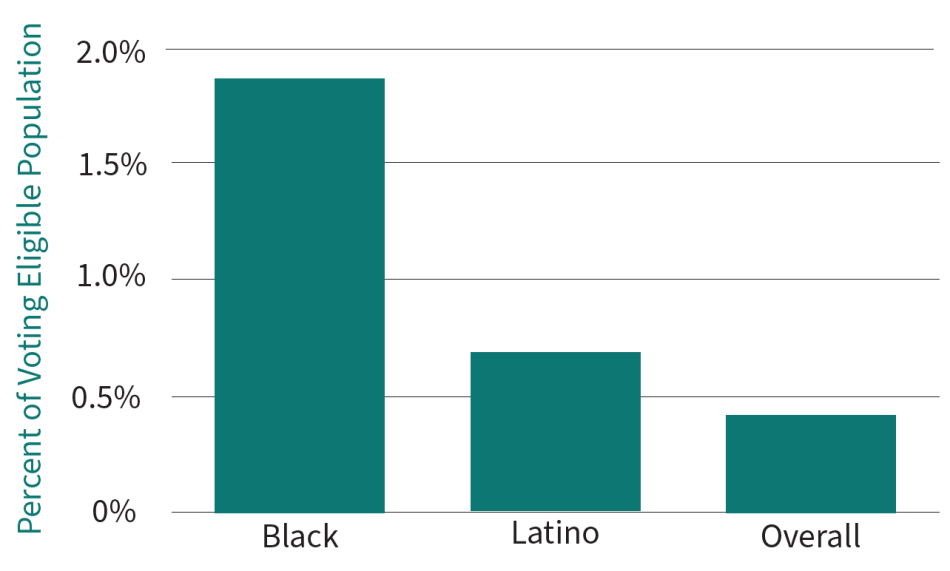 Black Pennsylvanians are excluded from voting at almost eight times the rate of non-Black Pennsylvanians. Latino Pennsylvanians are excluded at almost twice the rate of non-Latino Pennsylvanians.