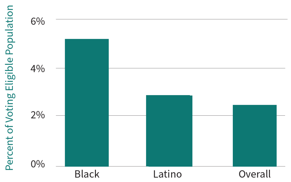 Texas’s voting ban results in stark racial injustices in ballot access. Voting eligible Black Texans are roughly 2.5 times as likely as non-Black Texans to lose their right to vote due a felony-level conviction. Latino Texans are 1.2 times as likely as non-Latino Texans to lose their right to vote due to a felony-level conviction.2
