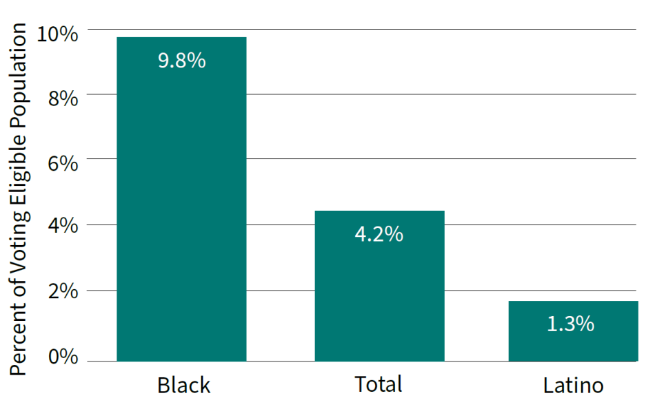Source: Uggen, C., Larson, R., Shannon, S., Stewart, R., & Hauf, M. (2024). Locked out 2024: Four million denied voting rights due to a felony conviction. The Sentencing Project.