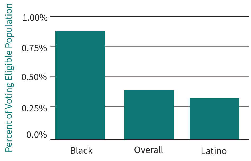 Maryland’s voting ban results in stark racial injustices in ballot access. Voting eligible Black Marylanders are over five times as likely as non-Black Marylanders to lose their right to vote due to incarceration for a felony conviction.3