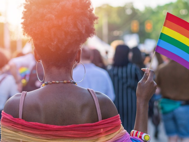 Woman in crowd holding a rainbow flag and wearing a rainbow shawl over her outfit