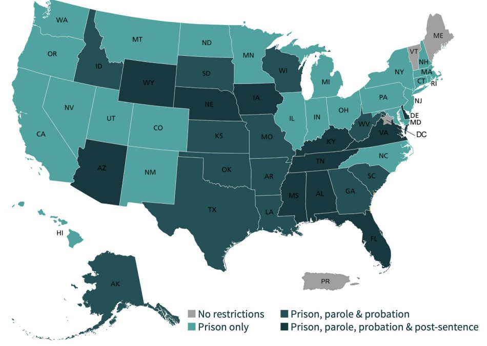 Sources: ACLU. (2023). Felony disenfranchisement laws (map); National Conference of State Legislatures. (2023). Felon voting rights; Uggen, C., Larson, R., Shannon, S., & Stewart, R. (2022). Locked out 2022: Estimates of people denied voting rights due to a felony conviction. The Sentencing Project.; U.S. Department of Justice (2022). Guide to state voting rules that apply after a criminal conviction.