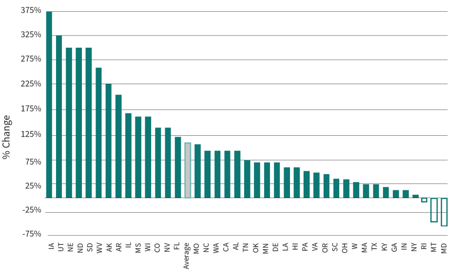 Though all states over punish some sexually-based offenses, there is variation across states in terms of the extent to which individuals are serving more time behind bars before release (see Figure 1). Iowa, Utah, Nebraska, North Dakota, and South Dakota saw at least a 300% increase in the number of individuals serving 10 or more years prior to release over this ten year period.47