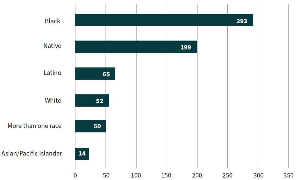 Youth of color are much more likely than white youth to be held in juvenile facilities. In 2023, the white incarceration rate in juvenile facilities was 52 per 100,000 youth under age 18. By comparison, the Black youth incarceration rate was 293 per 100,000, 5.6 times as high. Native youth2 were 3.8 times as high (199 per 100,000) and Latino youth were 25% more likely (65 per 100,000). Asian American youth were the least likely to be held in juvenile facilities (14 per 100,000).