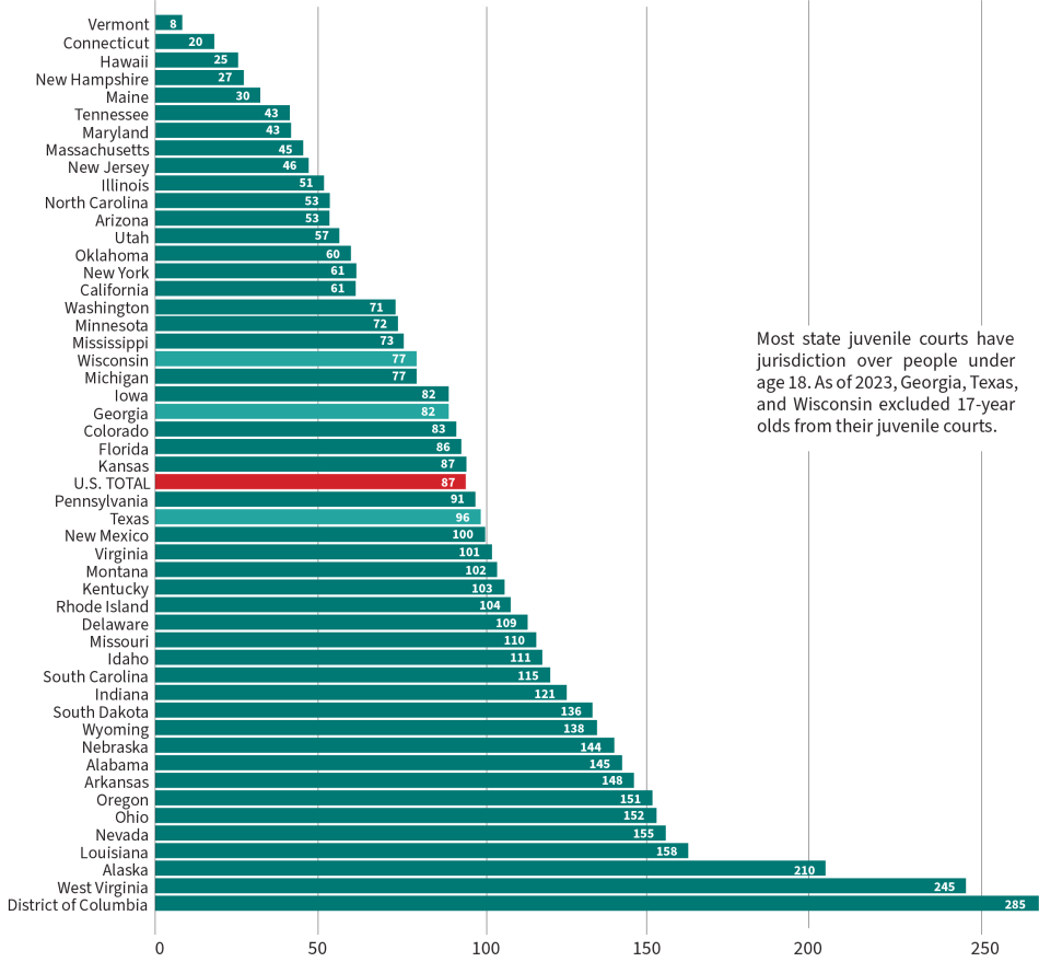On a typical day, 87 out of 100,000 youth nationwide are held in juvenile facilities, pre- and post-adjudication, with rates varying widely among states. The highest youth incarceration rate in 2023 was in the District of Columbia, where 285 out of 100,000 youth were incarcerated in juvenile facilities; the lowest rate was in Vermont, where the rate was 8 out of 100,000 youth.