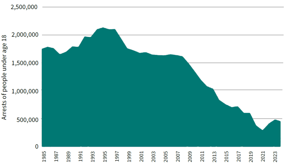 The number of arrests of people under 18 years old peaked in 1995 and has declined more than 75% since. Most youth arrests are for non-violent offenses: in 2024, just 8.5% of youth arrests were for offenses categorized by the FBI as Part 1 violent crimes (aggravated assault, robbery, rape, and murder). Youth arrests increased from 2021 to 2023 (before falling in 2024); the most recent arrest levels remain well below pre-pandemic levels.