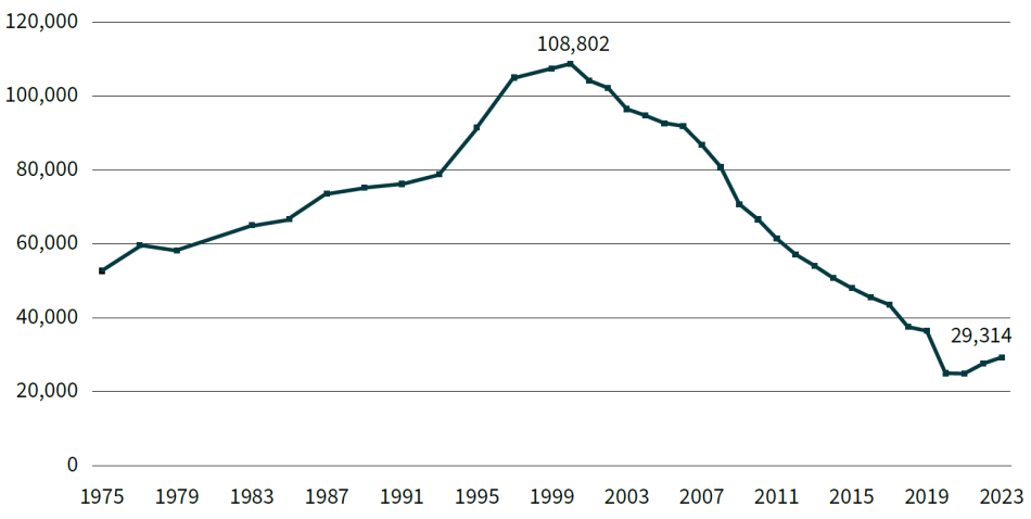 Figure 2. One-Day Count of Youth Held in Juvenile Justice Facilities, 1975-2023
