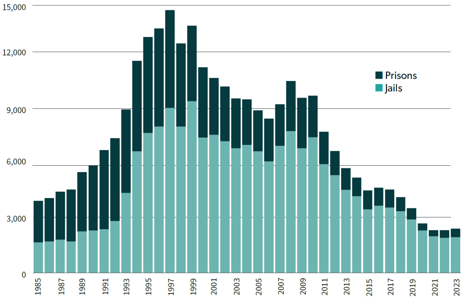 Sources: Austin, J., Johnson, K., & Gregoriou, M. (2000). Juveniles in adult prisons and jails: a national assessment. U.S. Department of Justice, Office of Justice Programs, Bureau of Justice Assistance; Miller, D. and Kluckow, R. (2023). Prisoners in 2023 – Statistical tables. U.S. Department of Justice, Bureau of Justice Statistics, and prior editions; Zeng, Z. Carson, E.A., and Kluckow, R. (2025). Just the stats; juveniles incarcerated in U.S. adult jails and prisons, 2002–2021. Bureau of Justice Statistics; Zeng, Z. (2025). Jail inmates in 2023 – statistical tables. U.S. Department of Justice, Bureau of Justice Statistics, and prior editions.
