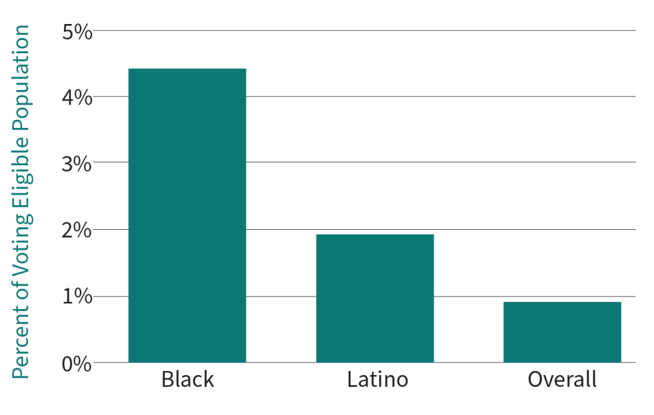 Felony disenfranchisement, or the loss of one’s voting rights due to a felony conviction, disproportionately affects Black and Latino Nebraskans. Voting eligible3 Black Nebraskans are disenfranchised at a rate over six times that of non-Black Nebraskans. Latino Nebraskans are disenfranchised at a rate over two times that of non-Latino Nebraskans. In Nebraska, one out of every 22 voting eligible Black citizens and roughly 1 out of every 52 voting eligible Latino citizens is banned from the ballot box due to a felony conviction.4