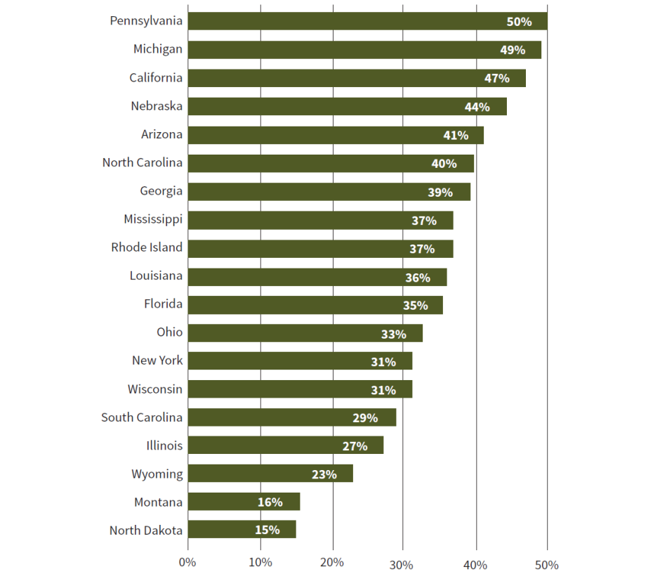 Two in five people sentenced to LWOP between 1995 and 2017 were younger than 26 when told they would die in prison, amounting to 11,613 people across these 20 states. A closer look at the state level (Figure 3) shows significant variation, with this proportion ranging from 15% to 50%. Pennsylvania (50%) leads the nation, closely followed by Michigan (49%) among states whose share of persons sentenced to LWOP were younger than 26 years of age, followed by California (47%).12