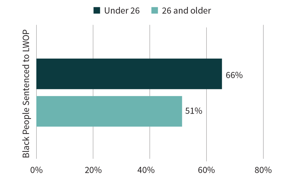 Moreover, two thirds (66%) of people under 26 years old sentenced to LWOP are Black compared with 51% of persons sentenced to LWOP beyond this age. As we show in this report, our analysis finds that being Black and young has produced a substantially larger share of LWOP sentences than being Black alone. This fact reinforces the growing understanding that extreme sentences disproportionately impact Black Americans.