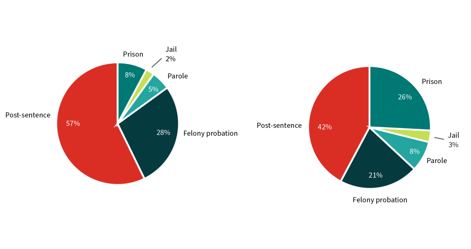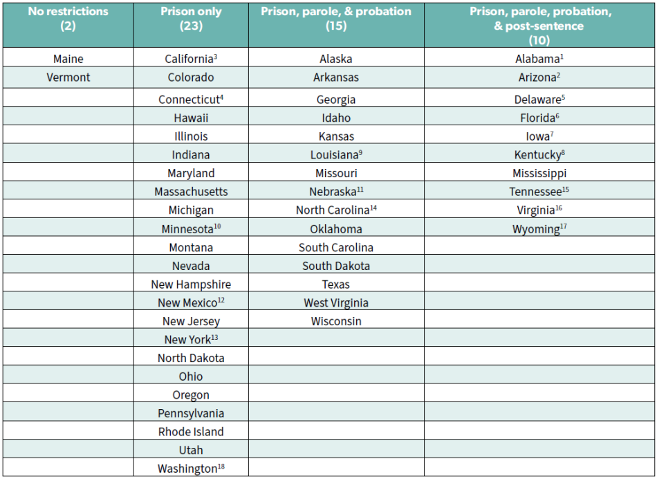| No restrictions (2) | Prison only (23) | Prison, parole & probation (15) | Prison, parole, probation & post-sentence (10) |