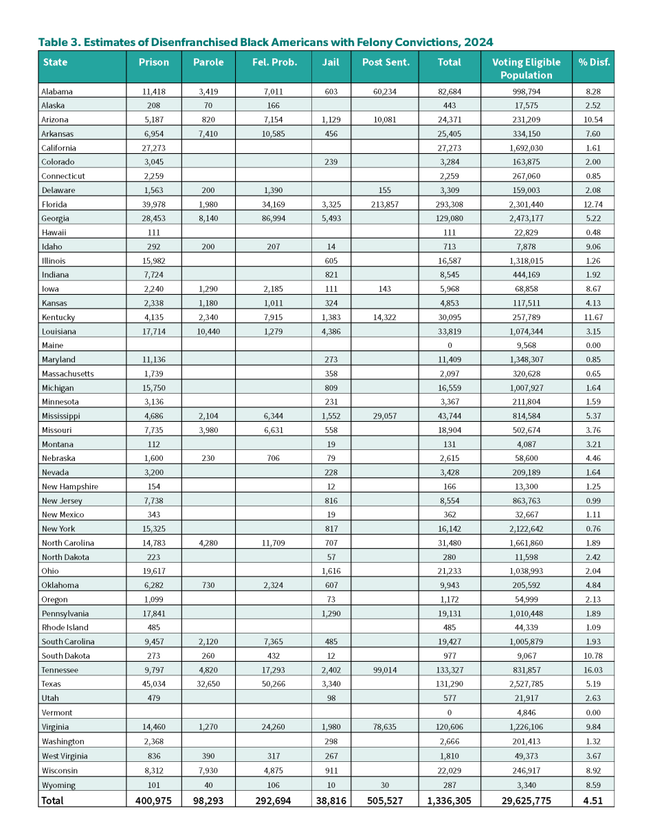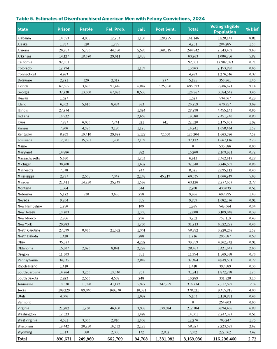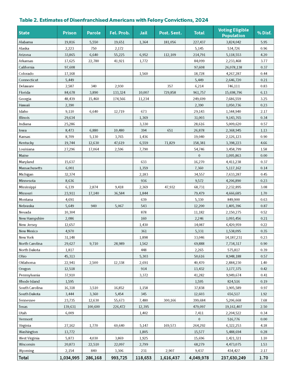- In two states – Florida and Tennessee – more than 6% of the adult population, one of every 17 adults, is disenfranchised.