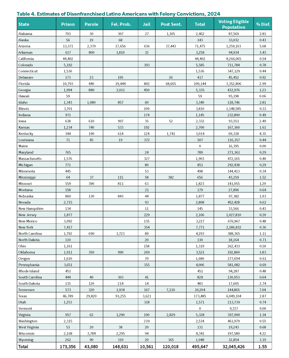 - Although data on ethnicity in correctional populations are unevenly reported and undercounted in some states, a conservative estimate is that at least 495,000 Latino Americans or 1.5% of the voting eligible population are disenfranchised.