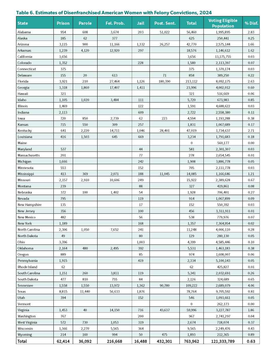 To estimate the percentage of disenfranchised female voters, we compiled sex-specific information on prison, parole, and felony probation populations and compiled state- and sex-specific life tables to obtain the post-sentence sex distribution. By this method, we estimate that approximately 764,000 women are disenfranchised in 2024, making up just under one-fifth of the total disenfranchised population. This represents about 0.63% of the female voting eligible population (or one in 159). Figure 9 and Table 6 depict female disenfranchisement rates, again showing great geographic variation across the states. In 8 states, the female felony disenfranchisement rate now exceeds 1% of the voting eligible female population: Alabama, Arizona, Arkansas, Florida, Kentucky, Mississippi, Tennessee, and Virginia. Seven of these states impose some form of post-sentence restrictions on voting (with Arkansas being the lone exception).