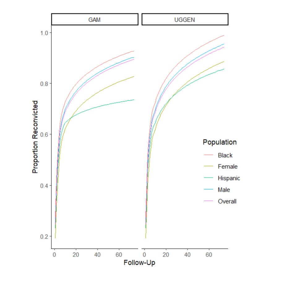 For population-specific recidivism estimates, we used the Bureau of Justice Statistics’ Recidivism of Prisoners Released in 24 States in 2008 (Antenangeli and Durose 2021) which contains a 10-year reconviction follow up for each population. We then model the cumulative failure from years 11-74, using both Uggen’s method (Uggen and Manza 2002) (the model used to create the recidivism curves in previous Locked Out iterations) and a generalized additive model (GAM) using a population-specific cubic spline. For Locked Out 2024, we use the GAM method, and predict cumulative failure for years 11-74. We choose the GAM method, as it is more sensitive to the “tapering-off” of recidivism failure in the later observed years. From these predictions, we obtained estimates of the percent recidivating of those remaining from the previous year by dividing each year’s predicted failure rate by the lagged cumulative survival, obtaining a recidivism hazard for each year (years 1-10 use the observed data points). Cumulative failure of recidivism amongst those released from prison by year 74 follow-up is estimated to be 89.5% overall, 82.8% for females, 90.4% for males, 73.6% for Latino releasees, and 92.9% for Black releasees. These population-specific recidivism hazards are used for all cohorts from 1948-2024 in the population-specific life tables.
