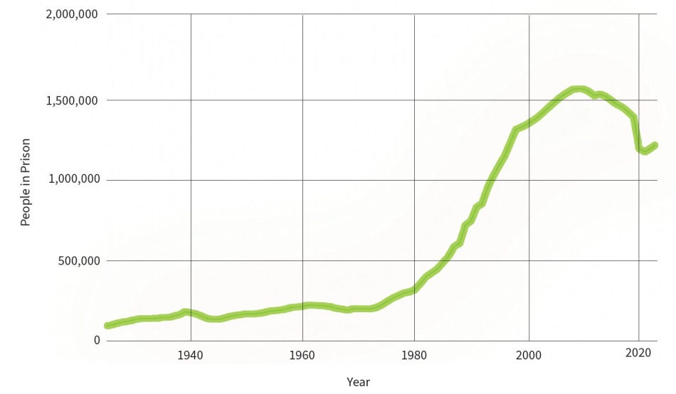 Sources: Cahalan, M. W. (1986). Historical corrections statistics in the United States, 1850-1984. Bureau of Justice Statistics; Mueller, D. and Kluckow, R. (2025). Prisoners in 2023 – Statistical tables. Bureau of Justice Statistics.