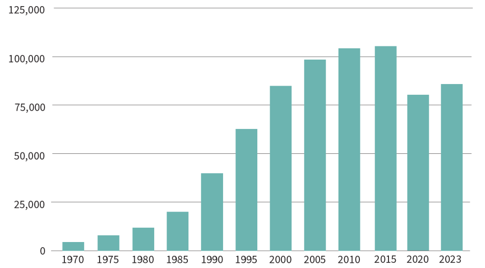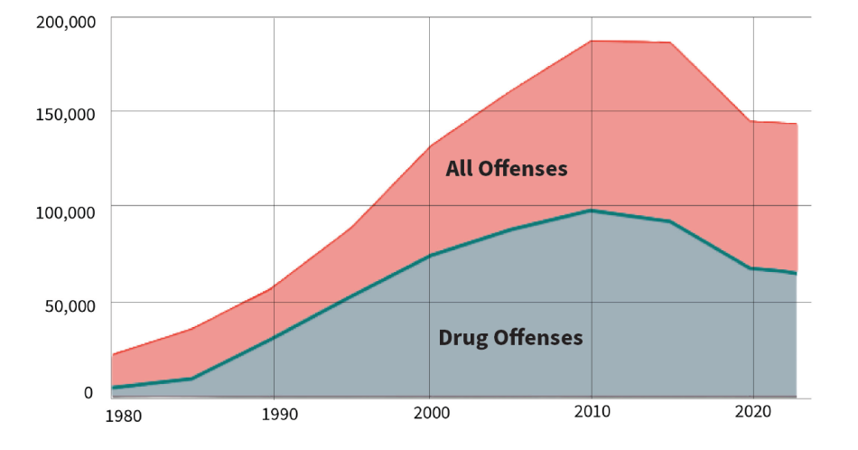 FIGURE 9. PEOPLE IN FEDERAL PRISON FOR DRUG OFFENSES, 1980-2023