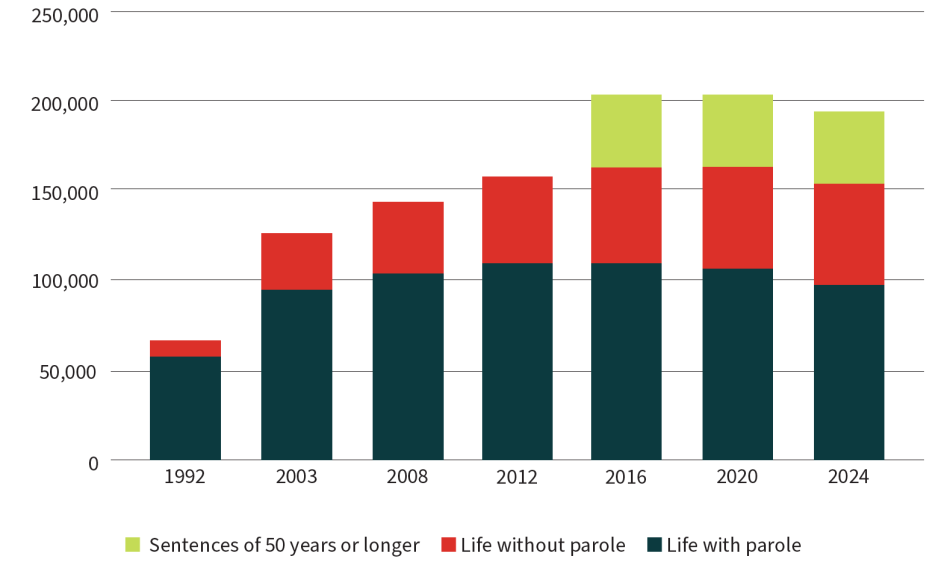 Sources: Figures for 1992 obtained from: Maguire, K., Pastore, A. L., & Flanagan, T. J. (Eds.) (1993). Sourcebook of Criminal Justice Statistics 1992. Bureau of Justice Statistics. Figures for 2005 obtained from: Liptak, A. (2005, October 5). Serving life with no chance at redemption. The New York Times. Data for 2003, 2008, 2012, 2016, 2020, and 2024 were collected from each state’s department of corrections by The Sentencing Project.