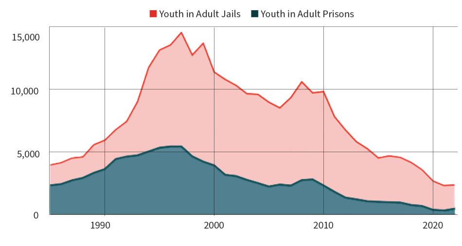 Sources: Austin, J., Johnson, K. D., & Gregoriou, M. (2000). Juveniles in adult prisons and jails: A national assessment. Bureau of Justice Assistance; Bureau of Justice Statistics Prison and Jail Inmates at Midyear Series; Bureau of Justice Statistics Prisoner Series; Strom, K. J. (2000). Profile of state prisoners under age 18, 1985-1997. Bureau of Justice Statistics; Zeng, Z. (2023). Jail inmates in 2023 – Statistical tables. Bureau of Justice Statistics.