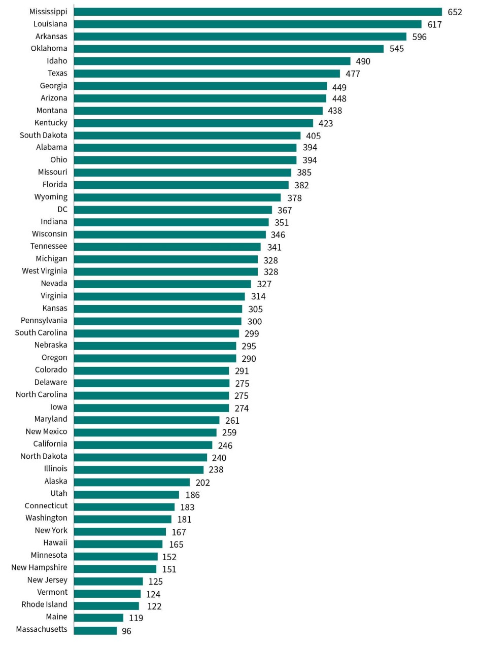 FIGURE 2. RANKED IMPRISONMENT RATES (PER 100,000 PEOPLE) IN STATE & FEDERAL PRISON, 2023
