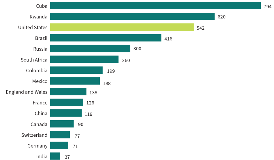 Source: World Prison Brief, compiled and hosted by the Institute of Crime and Justice Policy Research at Birkbeck, University of London. The graph above shows incarceration rates for 15 countries. The countries were selected to contextualize the U.S. rate and do not represent the 15 highest incarceration rates globally.