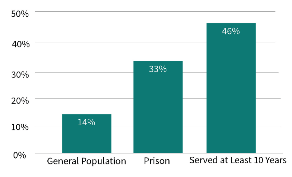 While Black Americans are vastly over-represented in the prison population, this disparity widens for those serving lengthy sentences. As depicted in Figure 8, in 2019, Black Americans represented 14% of the total U.S. population, 33% of the total prison population, and 46% of the prison population who had already served at least 10 years.19