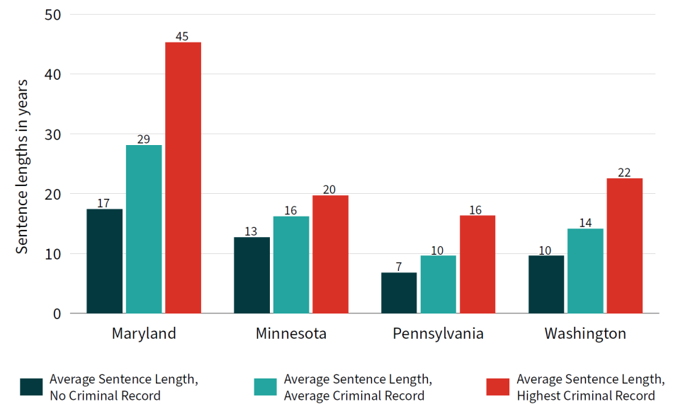 - In all four states, criminal records are a significant contributor to lengthy sentences (i.e., a sentence of 10 years or longer). Most people given lengthy sentences in these states had a criminal record.9 On average in Maryland, 63% of the duration of lengthy sentences for those with criminal records was attributable to their record; this value was 30% in Minnesota, 45% in Pennsylvania, and 41% in Washington.
