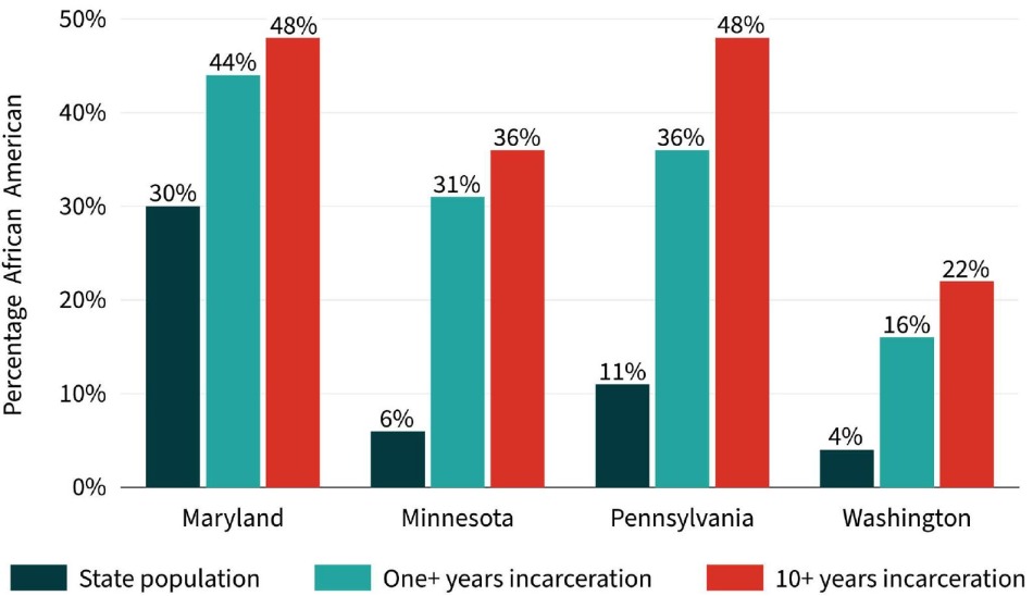 - African Americans are disproportionately impacted when criminal records lengthen sentences. Across the four states studied here, among persons sentenced to 10 years or longer, African Americans had criminal record scores—representing both length of history and offense severity—that were 26% higher than whites.10 This disparity contributed to African Americans receiving sentences that were significantly longer. Among people with sentences of 10 years or longer, African Americans averaged 31 years and seven months, while white individuals were sentenced to an average of 26 years and four months.
