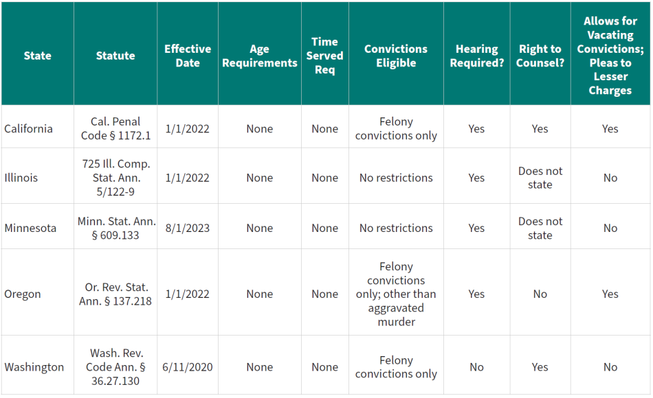 - In addition to California, five states – Illinois, Minnesota, Oregon, Washington, and Utah – have enacted prosecutor-initiated resentencing laws that allow prosecutors to request the court to reconsider a sentence.19