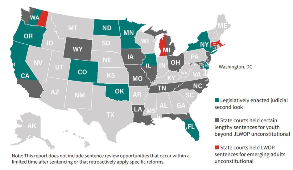 The report provides an overview of the second look laws passed by 15 state legislatures that provide judicial sentence review hearings beyond opportunities provided to those with JLWOP sentences – California, Colorado, Connecticut, Delaware, Florida, Georgia, Illinois, Maryland, Minnesota, New York, North Dakota, Oklahoma, Oregon, Utah, Washington – as well as the Council of the District of Columbia and the federal government.